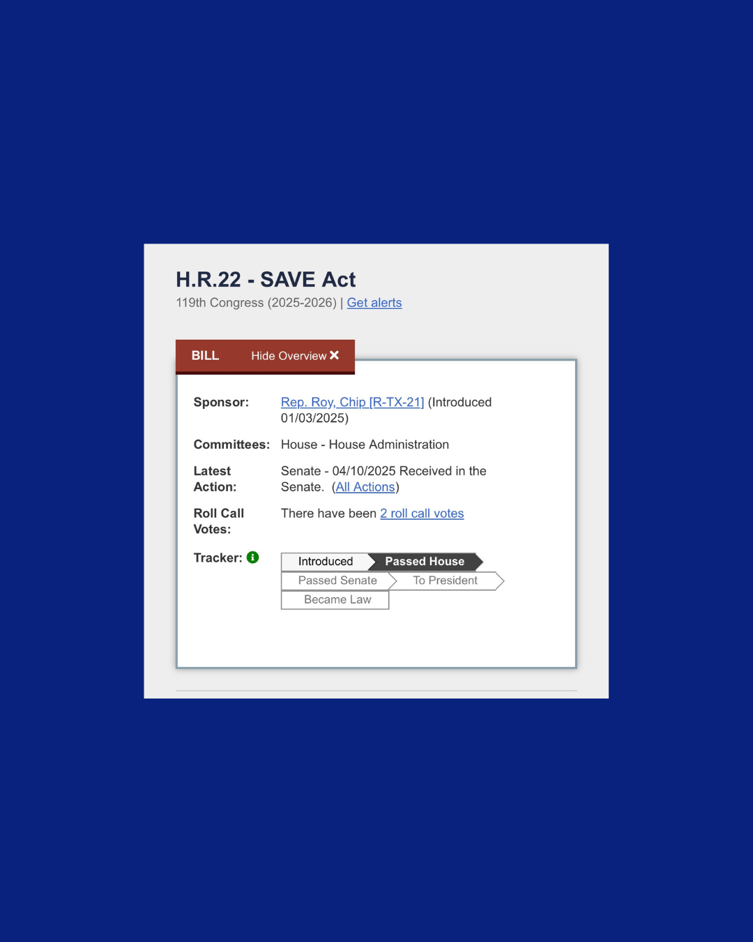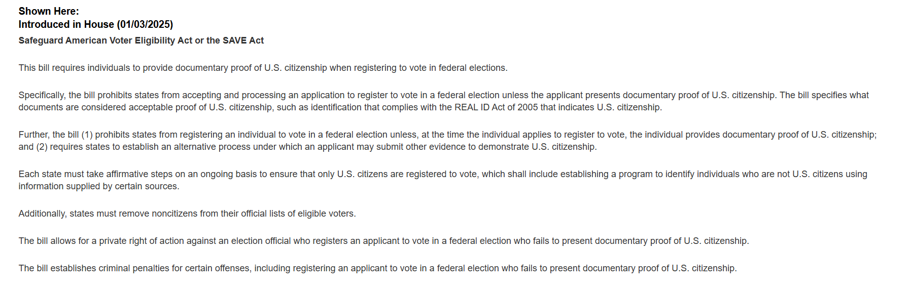 The SAVE Act (H.R.22) requires individuals to provide documentary proof of U.S. citizenship to register for federal elections. It mandates that states verify citizenship status, remove noncitizens from voter rolls, and establishes criminal penalties or private legal action for non-compliance by election officials.