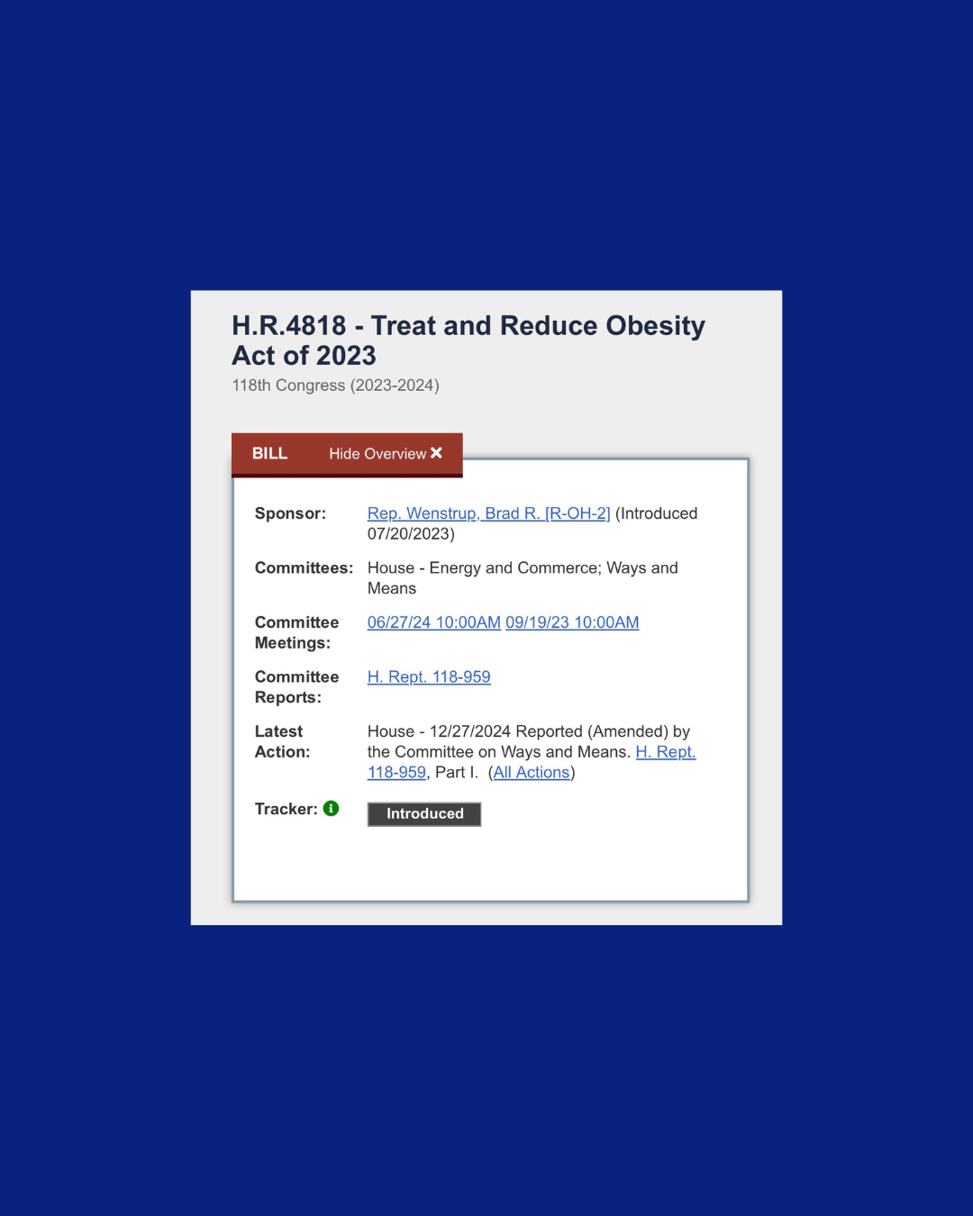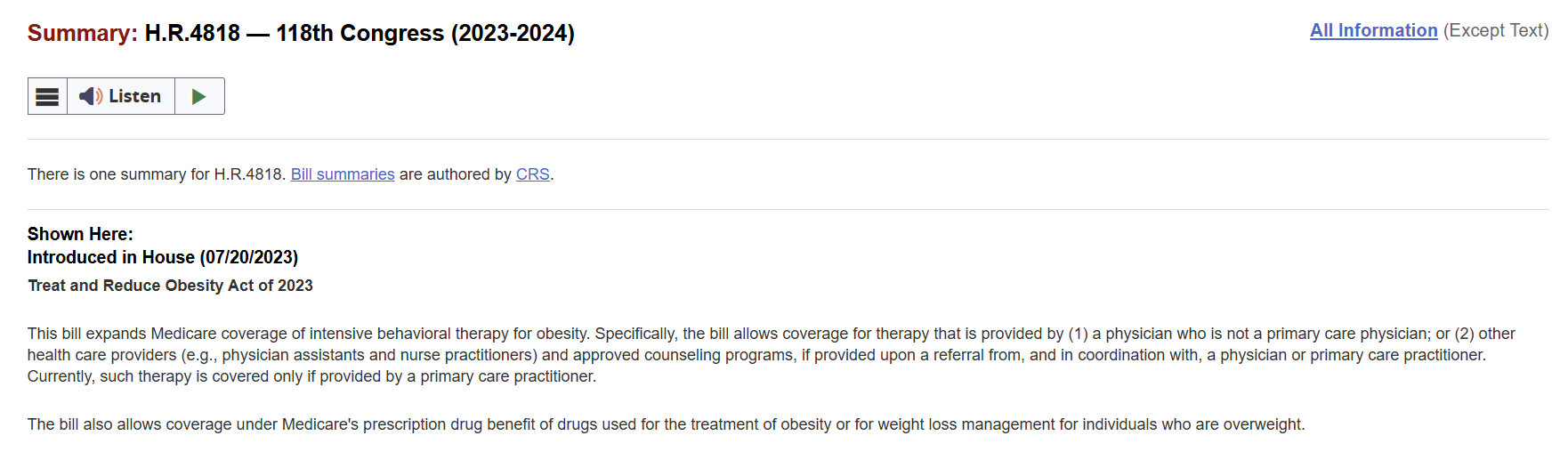 The Treat and Reduce Obesity Act of 2023 expands Medicare coverage to include obesity medications and broadens access to behavioral therapy. By allowing specialists, nurse practitioners, and physician assistants to provide counseling, it removes the current restriction that limits these services strictly to primary care settings.